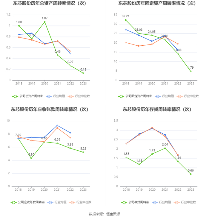 营运能力方面,2023年,公司公司总资产周转率为0.13次,上年同期为0.27次(2022年行业平均值为0.49次,公司位居同行业38/45);固定资产周转率为4.79次,上年同期为14.33次(2022年行业平均值为16.27次,公司位居同行业26/45);公司应收账款周转率、存货周转率分别为5.22次、0.66次。
