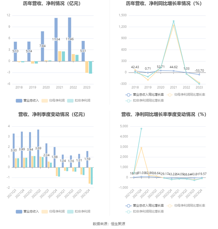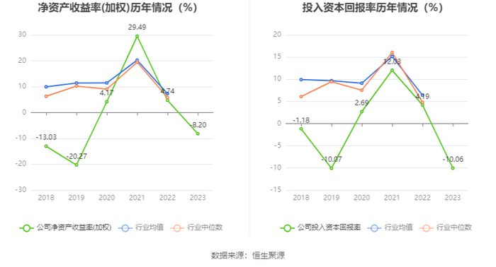 数据显示,2023年公司加权平均净资产收益率为-8.20%,较上年同期下降12.94个百分点;公司2023年投入资本回报率为-10.06%,较上年同期下降14.25个百分点。