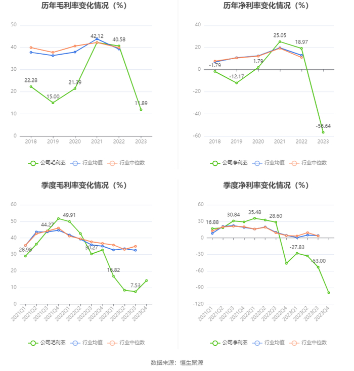 2023年,公司毛利率为11.89%,同比下降28.69个百分点;净利率为-56.64%,较上年同期下降75.61个百分点。从单季度指标来看,2023年第四季度公司毛利率为14.22%,同比下降18.49个百分点,环比上升6.69个百分点;净利率为-99.29%,较上年同期下降53.13个百分点,较上一季度下降46.29个百分点。