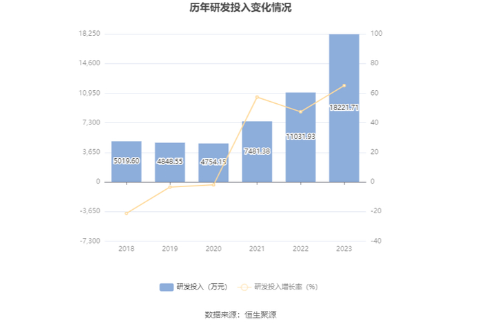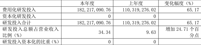 2023年全年,公司研发投入金额为1.82亿元,同比增长65.17%;研发投入占营业收入比例为34.34%,相比上年同期上升24.71个百分点。此外,公司全年研发投入资本化率为0。