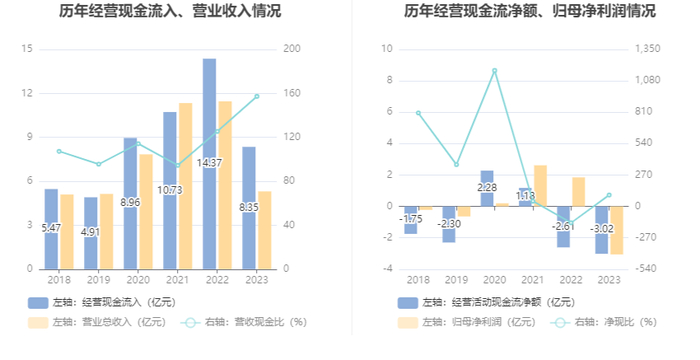 进一步统计发现,2023年公司自由现金流为-6.14亿元,上年同期为-2.65亿元。