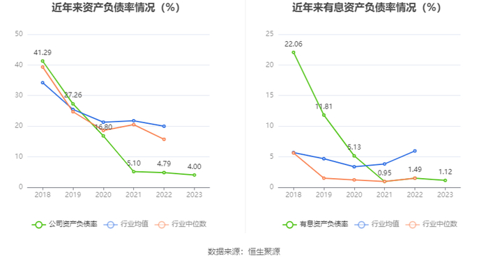 在偿债能力方面,公司2023年年末资产负债率为4.00%,相比上年末下降0.79个百分点;有息资产负债率为1.12%,相比上年末下降0.37个百分点。