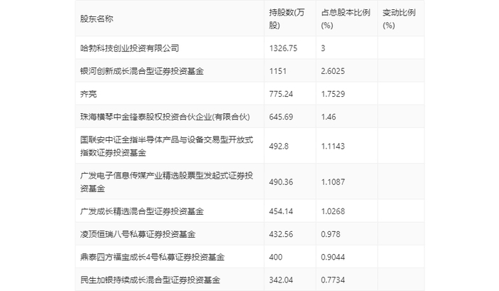 年报显示,2023年年末公司十大流通股东中,新进股东为银河创新成长混合型证券投资基金、凌顶恒瑞八号私募证券投资基金、民生加银持续成长混合型证券投资基金,取代了三季度末的德邦半导体产业混合型发起式证券投资基金、董玮、华夏上证科创板50成份交易型开放式指数证券投资基金。在具体持股比例上,齐亮、国联安中证全指半导体产品与设备交易型开放式指数证券投资基金、广发电子信息传媒产业精选股票型发起式证券投资基金持股有所下降。