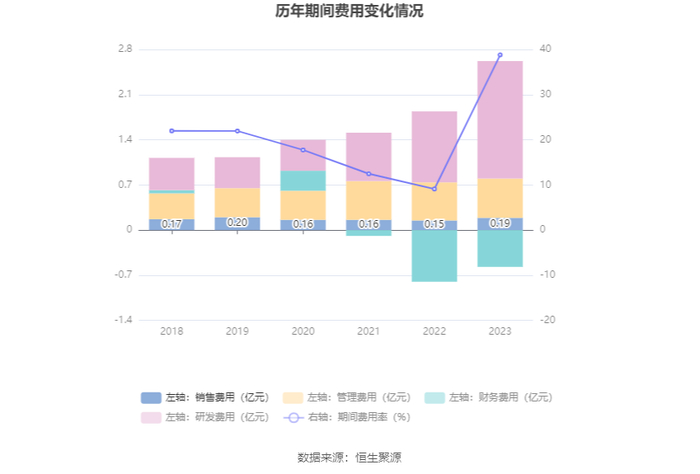 2023年,公司期间费用为2.06亿元,较上年同期增加1.01亿元;期间费用率为38.80%,较上年同期上升29.69个百分点。其中,销售费用同比增长27.93%,管理费用同比增长4.3%,研发费用同比增长65.17%,财务费用由去年同期的-7958.46万元变为-5670.98万元。