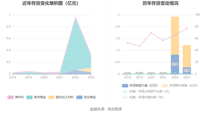 从存货变动来看,截至2023年年末,公司存货账面价值为3360.44万元,占净资产的0.73%,较上年末减少6450.83万元。其中,存货跌价准备为1.13亿元,计提比例为77.11%。