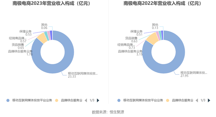 分产品来看,2023年公司主营业务中,移动互联网媒体投放平台业务收入23.33亿元,同比下降16.53%,占营业收入的86.65%;品牌综合服务业务收入1.78亿元,同比下降43.49%,占营业收入的6.62%;货品销售收入0.65亿元,同比增长2.14%,占营业收入的2.40%。