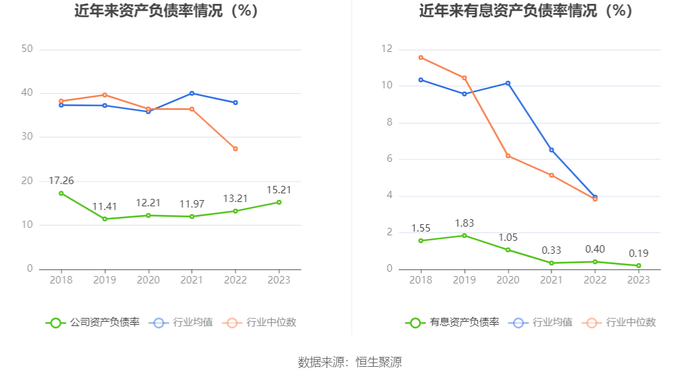 在偿债能力方面,公司2023年年末资产负债率为15.21%,相比上年末上升2.00个百分点;有息资产负债率为0.19%,相比上年末下降0.21个百分点。