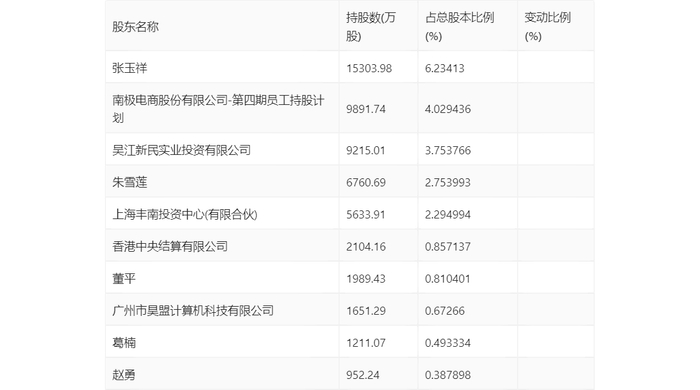 年报显示,2023年年末公司十大流通股东中,新进股东为南极电商股份有限公司-第四期员工持股计划,取代了三季度末的南极电商股份有限公司-第三期员工持股计划。在具体持股比例上,董平持股有所上升,吴江新民实业投资有限公司、香港中央结算有限公司、赵勇持股有所下降。