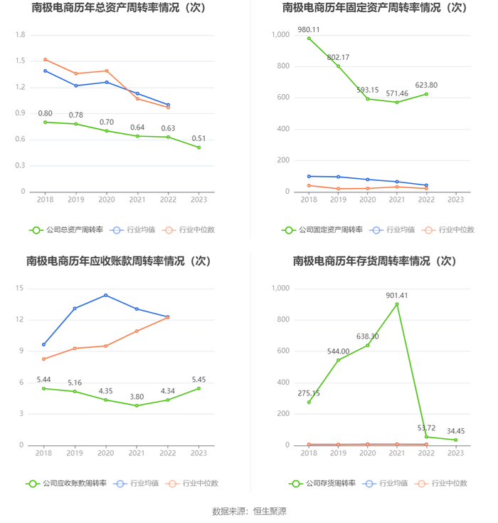 数据统计显示,南极电商近三年营业总收入复合增长率为-13.58%,在互联网电商行业已披露2023年数据的10家公司中排名第7。近三年净利润复合年增长率为-54.54%,排名8/10。