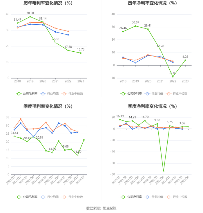 2023年,公司毛利率为15.73%,同比下降1.65个百分点;净利率为4.02%,较上年同期上升12.91个百分点。从单季度指标来看,2023年第四季度公司毛利率为21.29%,同比上升0.64个百分点,环比上升9.49个百分点;净利率为4.14%,较上年同期上升78.54个百分点,较上一季度上升0.28个百分点。