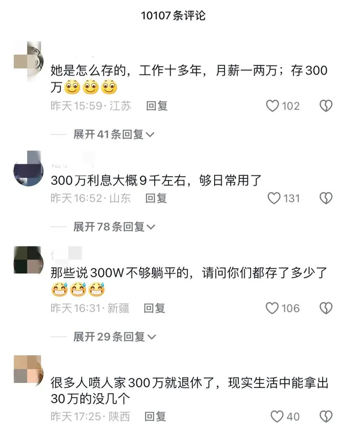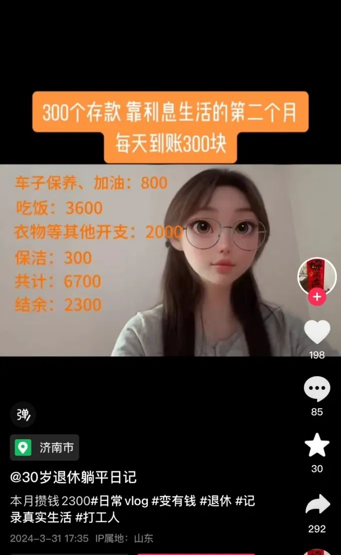 在该女子的视频账号里看到,女子分享了自己靠300万元存款利息生活的日常,并记录了一日三餐、购物、出行等具体消费金额。网友们很好奇:36岁怎么能存到300万元?纷纷在线求支招。