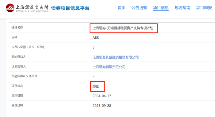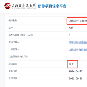 2024年4月17日,无锡恒基长盛融资租赁有限公司作为原始权益人的“上海证券-无锡恒基租赁资产支持专项计划”在上交所的项目状态为终止!拟发行金额5亿元,计划管理人上海证券有限责任公司,受理日期2023年9月28日。