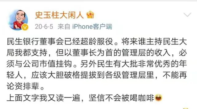 值得注意的是,早在2020年,史玉柱就曾发微博吐槽民生银行董事会“超龄服役”的现象,呼吁要给年轻人机会。