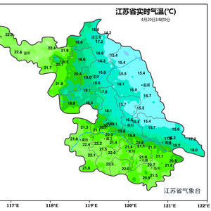 20日夜间苏南南部地区多云到阴有零星小雨,其他地区多云。21日白天全省多云到阴。最高温度:本省东部地区20℃左右,西北部地区26~27℃,其他地区22℃左右;最低温度:本省东北部地区10℃左右,其他地区12~13℃。全省偏东风3-4级。
