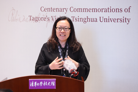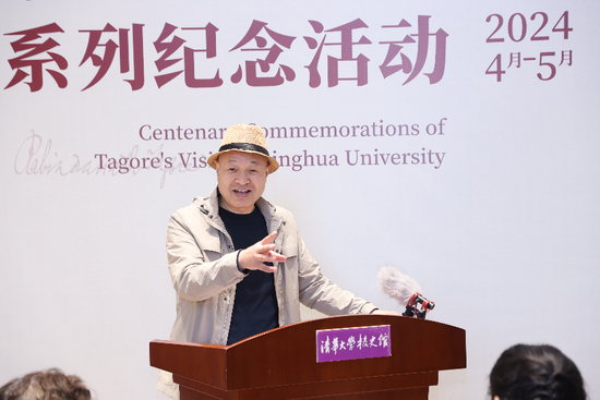 杨斌在致辞中表示,1924年泰戈尔来到中国,在清华停留一周并演讲,留下了一段难忘的人文佳话。泰戈尔在清华的演讲,对今天的青年、对今天的社会来说都颇具启发和教育意义。泰戈尔访华,代表的不仅仅是印度与中国两国,而是表达了希望这个世界能够更强的连接在一起、更好更长久的和平下去的愿望。泰戈尔的思想在今天仍具有现实意义。我们举办纪念泰戈尔访问清华100周年系列活动,意义重大,不仅是对那段历史的回顾,更是对当下的勉励和加油,表达了中国与世界各国之间不断增进交流、加强文明互鉴的期许,表明了清华积极承担国际交流合作的引领角色,充分发挥民间外交的作用,在深入推进国际合作和学术文化交流中自觉担当应尽的使命和责任。杨斌代表学校,对校史馆、外文系、图书馆、档案馆四个单位相互协作,充分发挥各自特点和优势,积极主动为学校中心工作服务,为国家发展大局服务,合力举办这样一系列纪念活动,给予充分肯定。杨斌还表示,这次活动内容丰富,形式多样,对弘扬和建设清华的优秀文化传统和浓厚学术氛围也很有意义。在校庆之际举办这项活动并向社会开放,本身就是学校教书育人的重要内容。他希望师生们一起享受系列活动所带来的美好,缅怀伟大的先哲泰戈尔,为世界文明进步作出积极贡献。