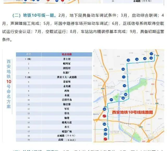 据当地媒体报道,西安地铁10号线一期将于2024年开通运营。西安市政府3月18日公布的附件《开通运营地铁线路实施方案》中提到,地铁10号线一期的进度计划等为:2月,地下段具备动车调试条件;3月,启动综合联调;4月,声屏障施工完成;5月,环园中路停车场开始动车调试;6月,正线信号系统取得空载试运行安全认证;7月,空载试运行;8月,车站站内精装修基本完成;9月,具备初期运营条件。