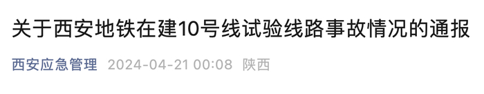 4月21日凌晨,“西安应急管理”发布“关于西安地铁在建10号线试验线路事故情况的通报”,通报全文如下: