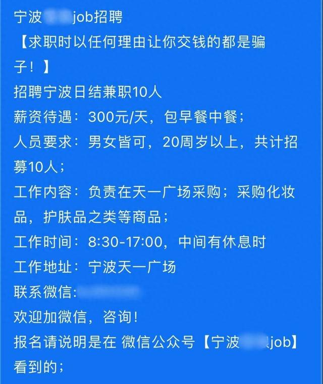 近日,大学生小美在某求职招聘公众号上看到一则招聘“商场采购员”的兼职广告。工作内容也相当简单,只需要在商场做“代购”,采购一些化妆品和护肤品就能拿到日薪300元的报酬,还能包早午餐。看到这些诱人的条件后,小美立即根据招聘广告上提供的微信号添加对方为好友了解具体工作内容。