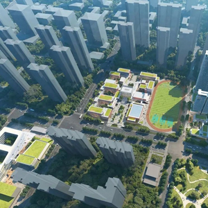 武汉英中学校新校区古田路鸟瞰效果图。