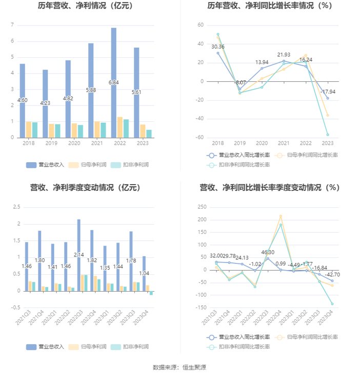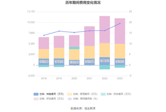 2023年,公司期间费用为1.09亿元,较上年同期减少120.45万元;但期间费用率为19.48%,较上年同期上升3.32个百分点。其中,销售费用同比下降17.68%,管理费用同比增长5.4%,研发费用同比下降5.67%,财务费用由去年同期的-1038.51万元变为-616.26万元。