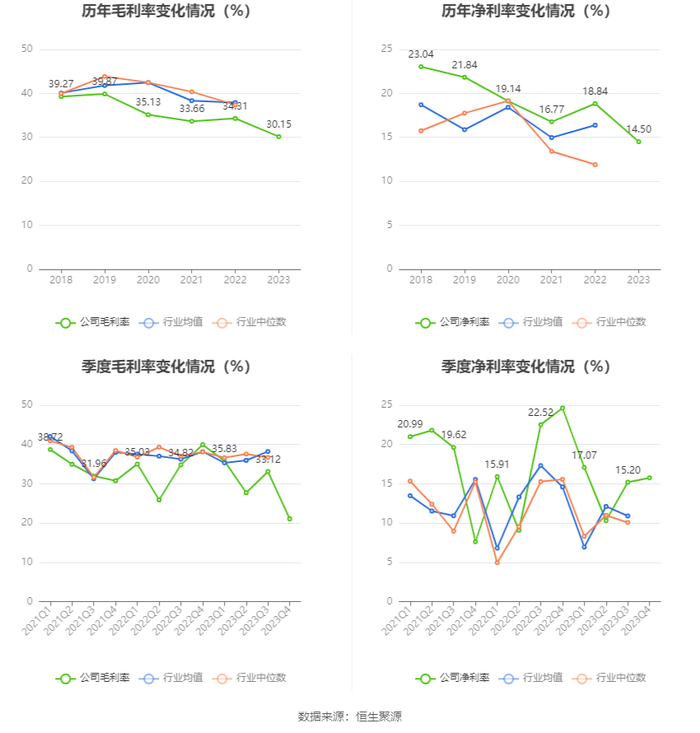 2023年,公司毛利率为30.15%,同比下降4.16个百分点;净利率为14.50%,较上年同期下降4.34个百分点。从单季度指标来看,2023年第四季度公司毛利率为21.08%,同比下降18.87个百分点,环比下降12.04个百分点;净利率为15.76%,较上年同期下降8.88个百分点,较上一季度上升0.56个百分点。