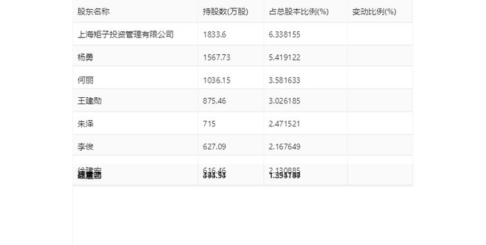 年报显示,2023年年末公司十大流通股东中,持股最多的为上海矩子投资管理有限公司,占比6.34%。十大流通股东名单相比2023年三季报维持不变。在具体持股比例上,聂庆元持股有所上升,朱泽、赵慧芸持股有所下降。