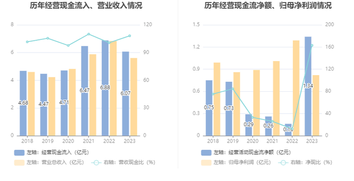 2023年,公司营业收入现金比为108.21%,净现比为163.08%。
