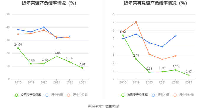 在偿债能力方面,公司2023年年末资产负债率为8.67%,相比上年末下降4.72个百分点;有息资产负债率为0.47%,相比上年末下降0.68个百分点。