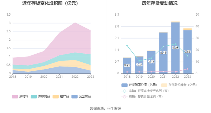 从存货变动来看,截至2023年年末,公司存货账面价值为2.58亿元,占净资产的15.11%,较上年末减少4718.2万元。其中,存货跌价准备为1068.87万元,计提比例为3.98%。