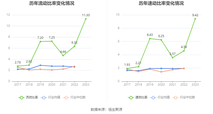 2023年,公司流动比率为11.30,速动比率为9.42。