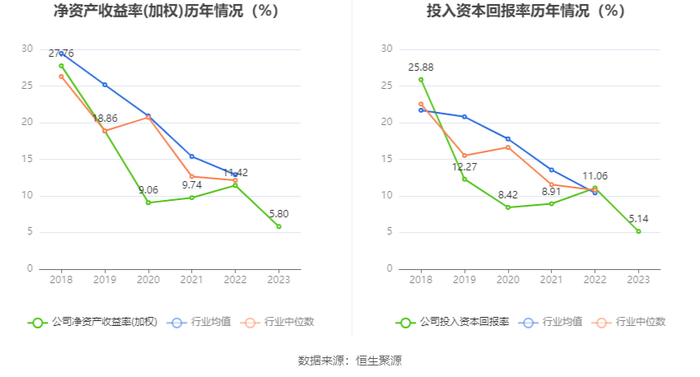 数据显示,2023年公司加权平均净资产收益率为5.80%,较上年同期下降5.62个百分点;公司2023年投入资本回报率为5.14%,较上年同期下降5.92个百分点。