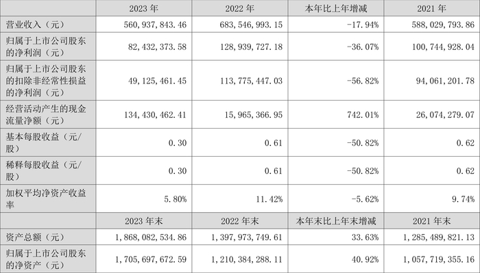 2023年,公司经营活动现金流净额为1.34亿元,同比增长742.01%;筹资活动现金流净额3.68亿元,同比增加3.95亿元;投资活动现金流净额-2.11亿元,上年同期为-7734.46万元。