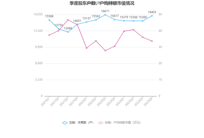 筹码集中度方面,截至2023年年末,公司股东总户数为1.64万户,较三季度末增长了1043户,增幅6.79%;户均持股市值由三季度末的36.12万元下降至33.72万元,降幅为6.64%。