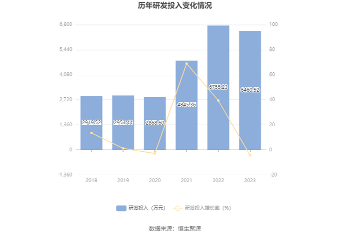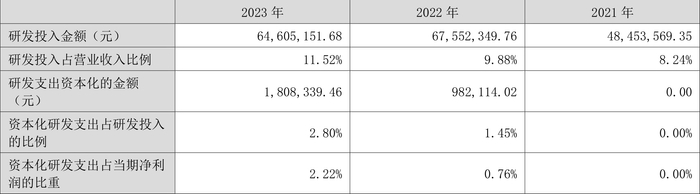 2023年全年,公司研发投入金额为6460.52万元,同比下降4.36%;研发投入占营业收入比例为11.52%,相比上年同期上升1.64个百分点。此外,公司全年研发投入资本化率为2.80%。
