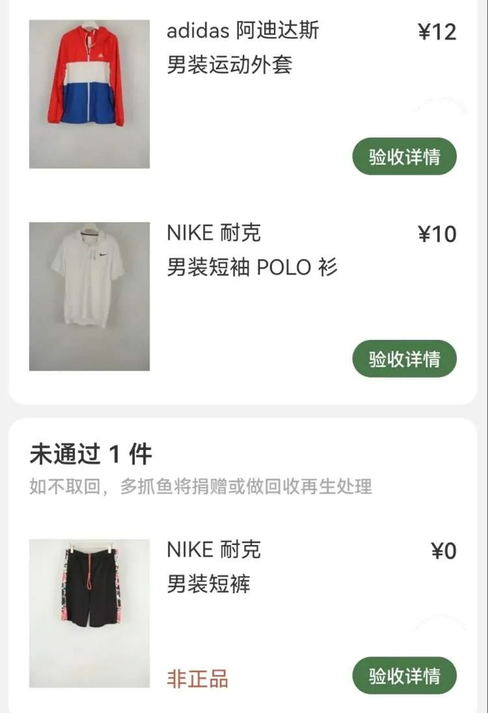 家住上海普陀的何先生,最近在多抓鱼上上传处理了5件衣服,“5件衣服预估一共回收总收入能达到211元,但实际上最终成交的回收收入是10元……真是让人大跌眼镜。”原来,一件衣服被判定成非正品,安德玛的几乎全新的经典款短袖只评估成9元……“审核结果我是很难接受的,回收价远低于预期,所以寄过去5件衣服,我选择取回4件,最终一件T恤回收了10元。”