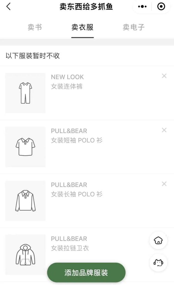 “Pull&Bear、New Look的很多品类都不收,Zara的长袖罩衫、休闲裤、UR的冬季连衣裙也不收,不太理解多抓鱼的回收逻辑。既然不收,干嘛要列出来呢。”小阳说,自己认真地把成色不错的旧衣一件件摆出来,在多抓鱼小程序上添加品牌服装、输入品牌名称,有多个支线、联名的还要选择具体品牌,再选择衣服类目,一通操作后,却收到的是“抱歉,这件暂时不收”。