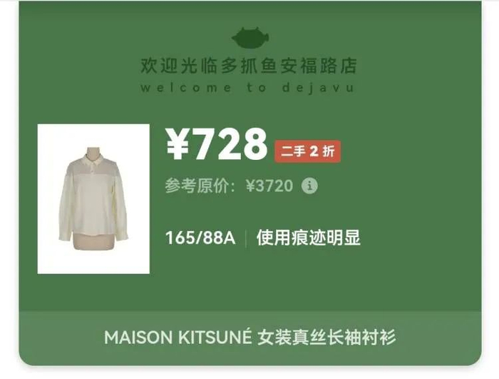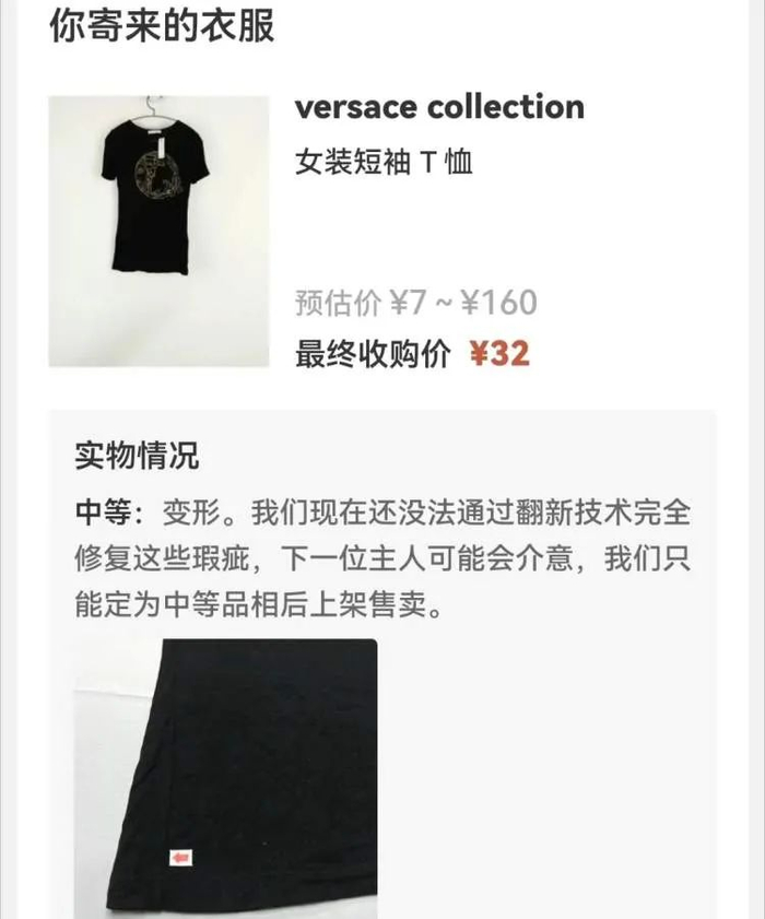 “这有什么的,我有一件MSGM的带真丝的T恤,买的时候3000多元,多抓鱼给的评价是品相很好,结果估价3元!”周周同样吐槽回收价离谱。