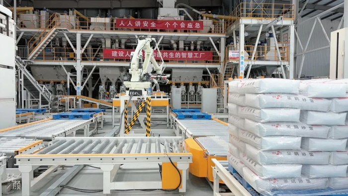 数万平方米的厂房、自动化的生产车间、能自主装袋打包的机器人……走进金隅砂浆公司的生产车间,一排排砂浆袋码起的围墙“整装待发”,即将运往全国各地。