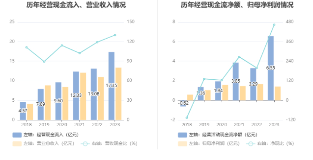 2023年,公司经营活动现金流净额为6.55亿元,同比增长99.10%;筹资活动现金流净额13.61亿元,同比增加1.84亿元;投资活动现金流净额-19.47亿元,上年同期为-17.02亿元。