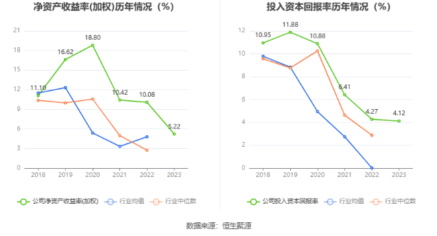数据显示,2023年公司加权平均净资产收益率为5.22%,较上年同期下降4.86个百分点;公司2023年投入资本回报率为4.12%,较上年同期下降0.15个百分点。