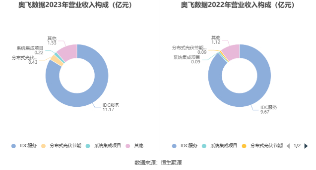 分产品来看,2023年公司主营业务中,IDC服务收入11.17亿元,同比增长15.53%,占营业收入的83.68%;分布式光伏节能收入0.43亿元,同比增长380.83%,占营业收入的3.20%;系统集成项目收入0.22亿元,同比增长139.63%,占营业收入的1.62%。