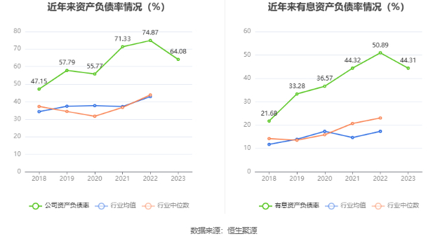 在偿债能力方面,公司2023年年末资产负债率为64.08%,相比上年末下降10.79个百分点;有息资产负债率为44.31%,相比上年末下降6.58个百分点。