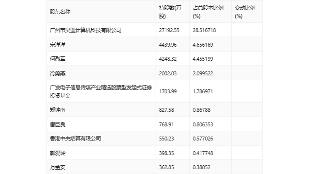 年报显示,2023年年末公司十大流通股东中,新进股东为广发电子信息传媒产业精选股票型发起式证券投资基金、郑钟南、万金安,取代了三季度末的长江证券股份有限公司、陈丽明、李雨时。在具体持股比例上,冷勇燕持股有所上升,广州市昊盟计算机科技有限公司、宋洋洋、何烈军、香港中央结算有限公司持股有所下降。