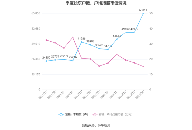 筹码集中度方面,截至2023年年末,公司股东总户数为6.58万户,较三季度末增长了1.62万户,增幅32.76%;户均持股市值由三季度末的17.68万元下降至15.34万元,降幅为13.24%。