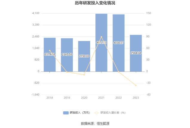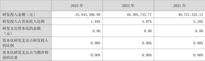 2023年全年,公司研发投入金额为2584.34万元,同比下降35.88%;研发投入占营业收入比例为1.94%,相比上年同期下降1.73个百分点。此外,公司全年研发投入资本化率为0。