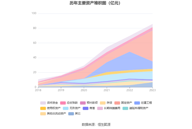 资产重大变化方面,截至2023年年末,公司固定资产较上年末增加221.12%,占公司总资产比重上升30.21个百分点;在建工程较上年末减少60.29%,占公司总资产比重下降24.31个百分点;其他非流动资产较上年末减少83.79%,占公司总资产比重下降6.34个百分点;货币资金较上年末减少15.78%,占公司总资产比重下降2.35个百分点。