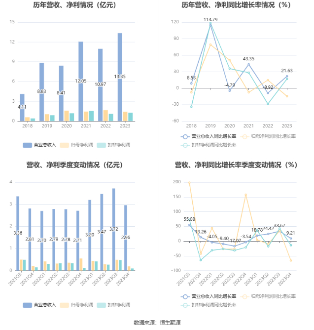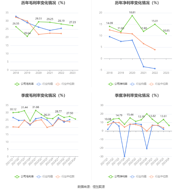 2023年,公司毛利率为27.23%,同比下降0.96个百分点;净利率为10.85%,较上年同期下降4.16个百分点。从单季度指标来看,2023年第四季度公司毛利率为25.71%,同比下降0.30个百分点,环比下降1.79个百分点;净利率为6.54%,较上年同期下降13.71个百分点,较上一季度下降7.07个百分点。