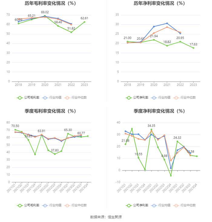 2023年,公司毛利率为62.61%,同比上升10.79个百分点;净利率为17.63%,较上年同期下降3.32个百分点。从单季度指标来看,2023年第四季度公司毛利率为62.01%,同比上升20.18个百分点,环比上升1.24个百分点;净利率为11.80%,较上年同期上升16.31个百分点,较上一季度下降0.78个百分点。