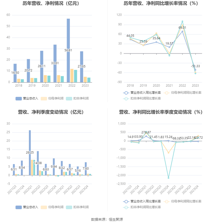 万孚生物(300482)4月22日披露2023年年报。2023年,公司实现营业总收入27.65亿元,同比下降51.33%;归母净利润4.88亿元,同比下降59.26%;扣非净利润4.15亿元,同比下降62.46%;经营活动产生的现金流量净额为3.29亿元,同比下降80.46%;报告期内,万孚生物基本每股收益为1.1元,加权平均净资产收益率为10.86%。公司2023年年度利润分配预案为:拟向全体股东每10股派4元(含税)。