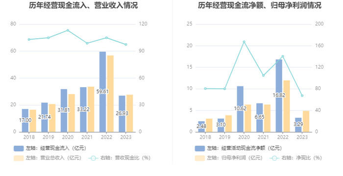 2023年,公司经营活动现金流净额为3.29亿元,同比下降80.46%;筹资活动现金流净额-5.42亿元,同比减少5.77亿元;投资活动现金流净额-1.13亿元,上年同期为-15.61亿元。